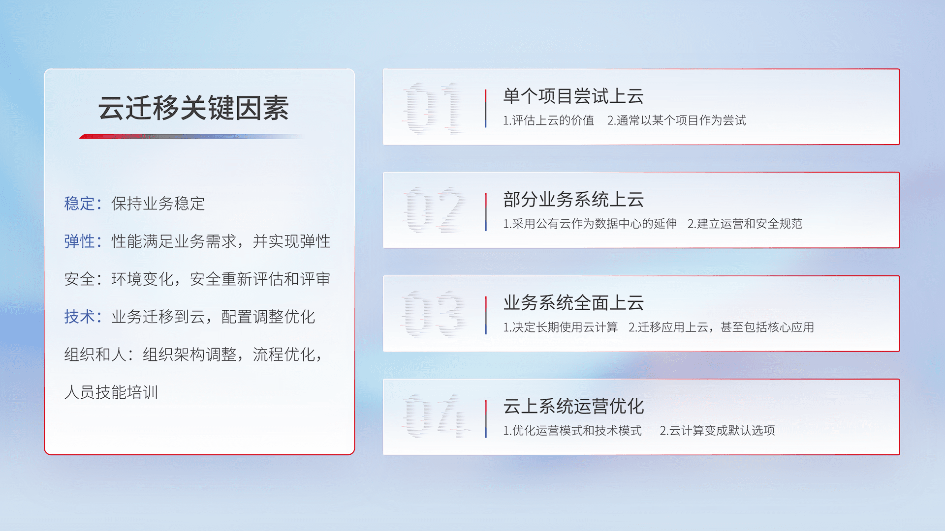 结合实际业务,,,,从规划设计、、云平台选型、、、、云原生改造、、数据迁移、、、集成交付,,,迁移全过程为客户识别最佳上云路径,,,做好风险识别管理,,设计网络架构、、身份权限、、、、安全审计合规、、、操作审计、、、日志审计、、、监控告警策略、、多站点容灾设计等,,,对云上基础设施进行整体规划,,,,提升IT治理水平,,,,以满足弹性、、、、高可用、、、高性能的需求。。